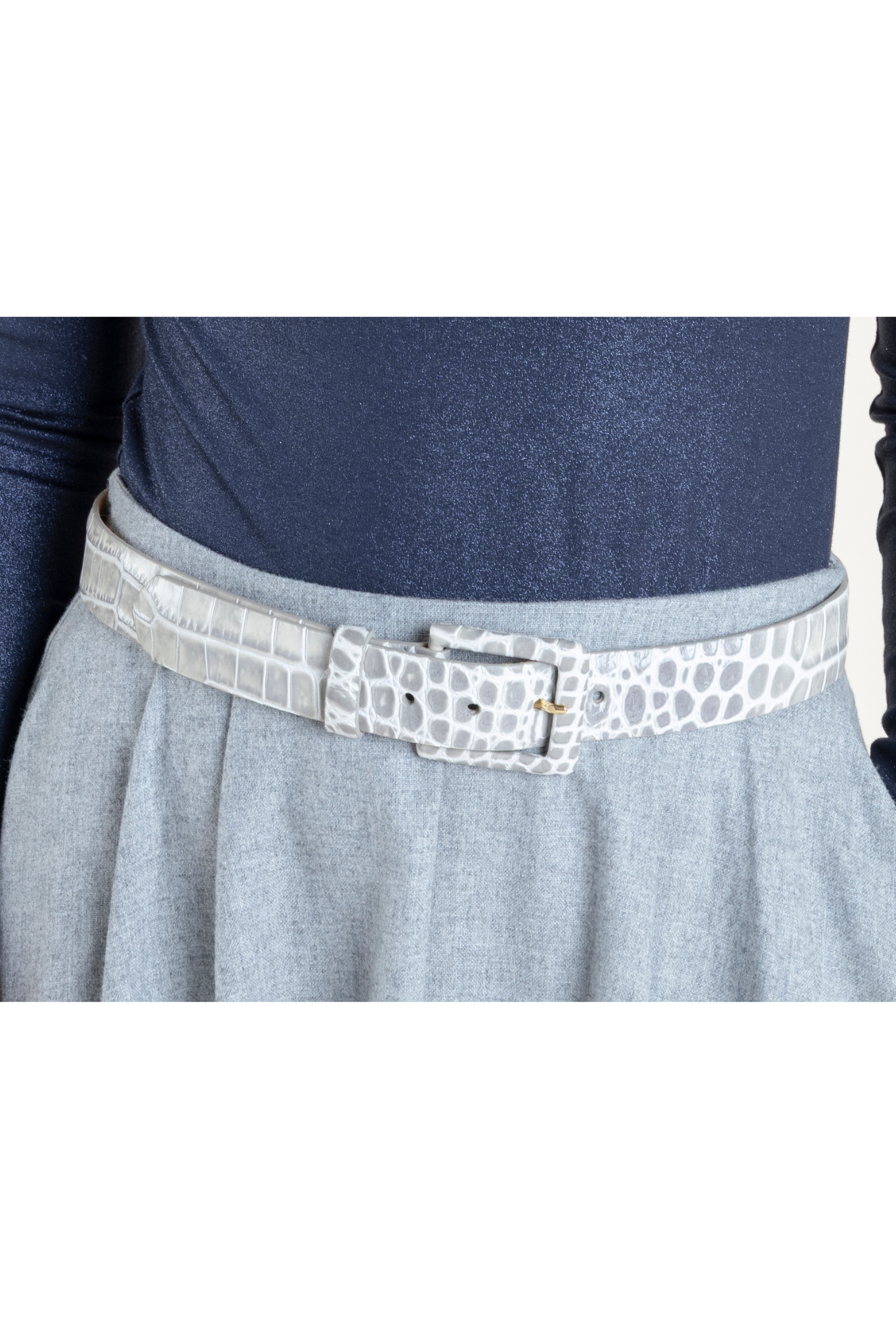 This is a sleek belt crafted in a refined glossy finish. The design showcases a tonal crocodile-embossed texture that adds depth and sophistication, while the subtle sheen enhances its luxe appeal. It features a squared buckle, also wrapped in the same embossed leather, with a polished gold prong that offers just the right touch of contrast. The belt’s slim silhouette makes it versatile—perfect for cinching the waist over dresses, skirts, or trousers—while the light neutral hue ensures it pairs seamlessly with a wide range of colors and fabrics. Both modern and timeless, this piece brings understated Italian elegance to everyday styling