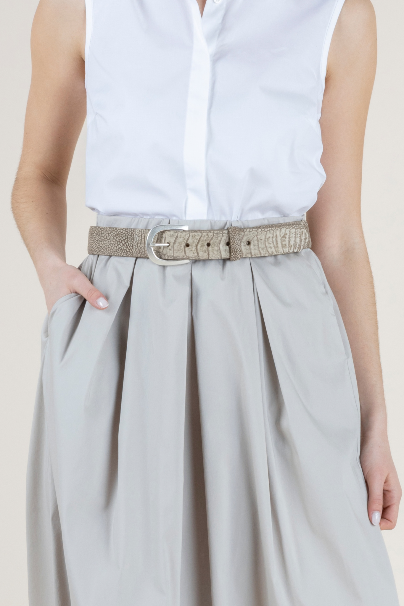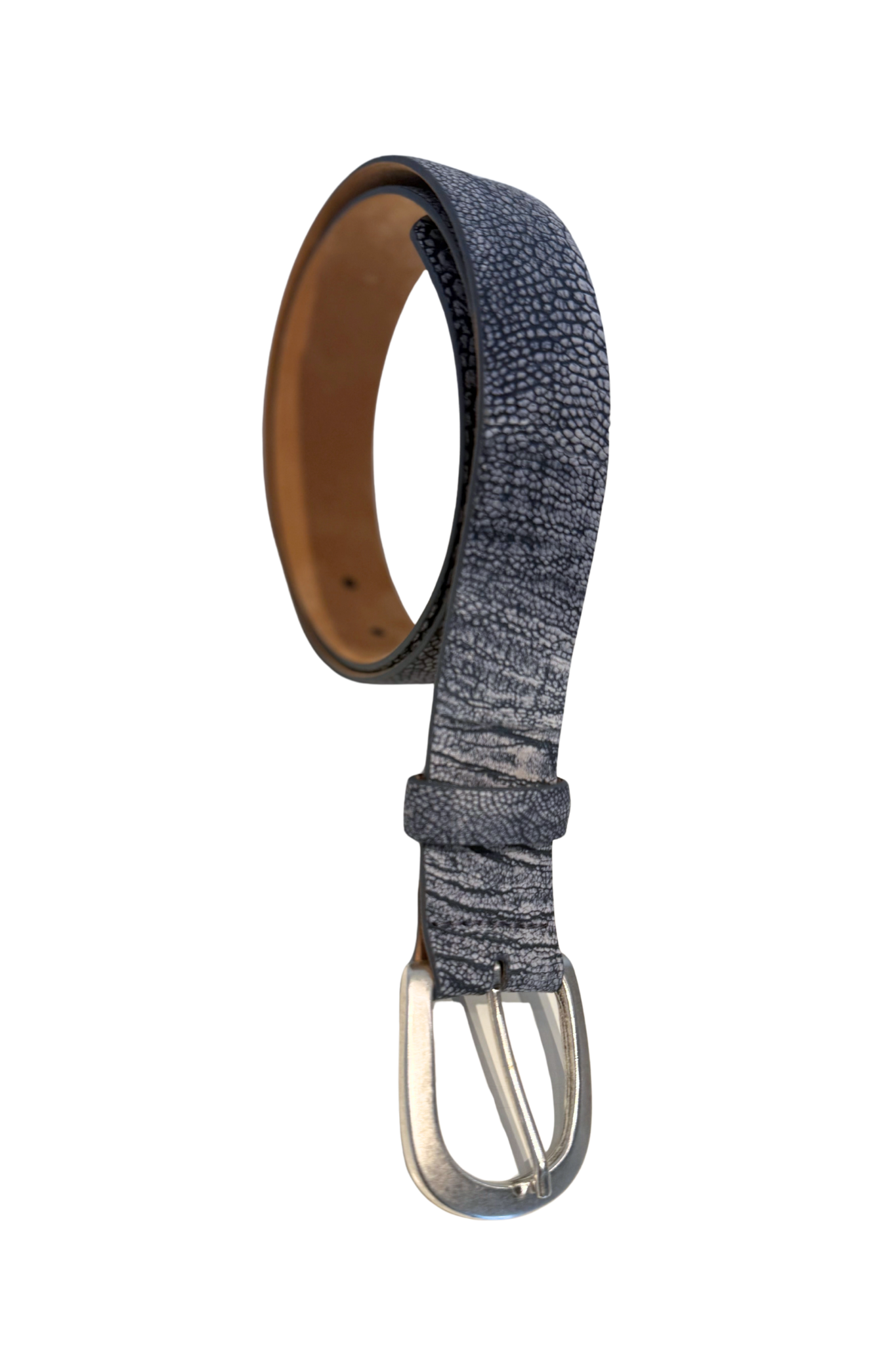 The Savannah Belt by W. Kleinberg is a refined accessory that brings understated luxury to any ensemble. Crafted from distinctive washed ostrich leg leather, the belt showcases a beautifully textured surface that highlights the natural pattern of the hide, giving each piece its own unique character. The softly structured leather pairs effortlessly with both tailored and relaxed silhouettes, making it an elegant finishing touch for dresses, skirts, and trousers alike. A brushed silver buckle adds a subtle, polished accent while maintaining the belt’s timeless versatility. Available in both tan and navy, the Savannah Belt blends artisanal craftsmanship with everyday sophistication—an elevated staple designed to complement a wide range of looks