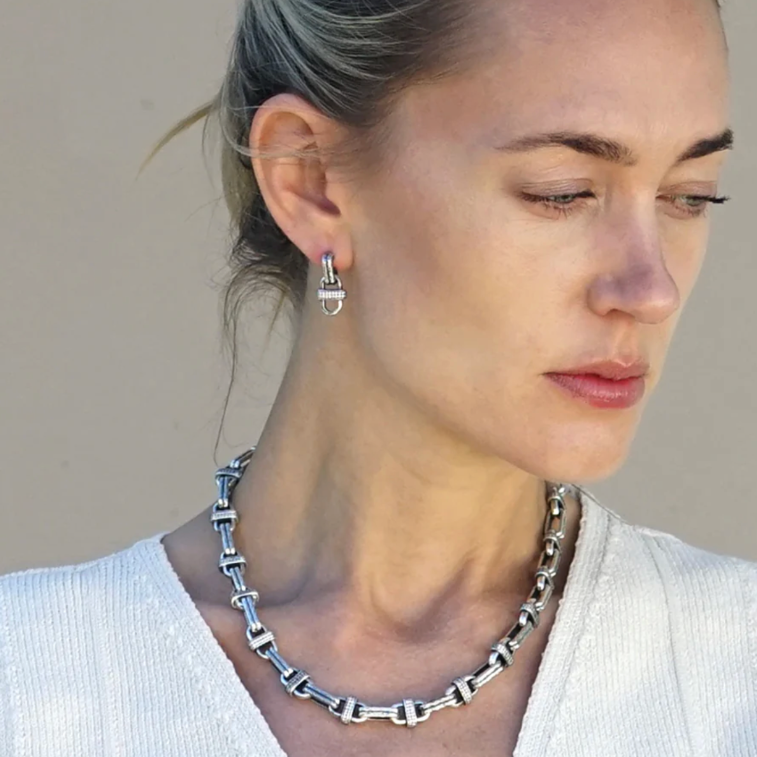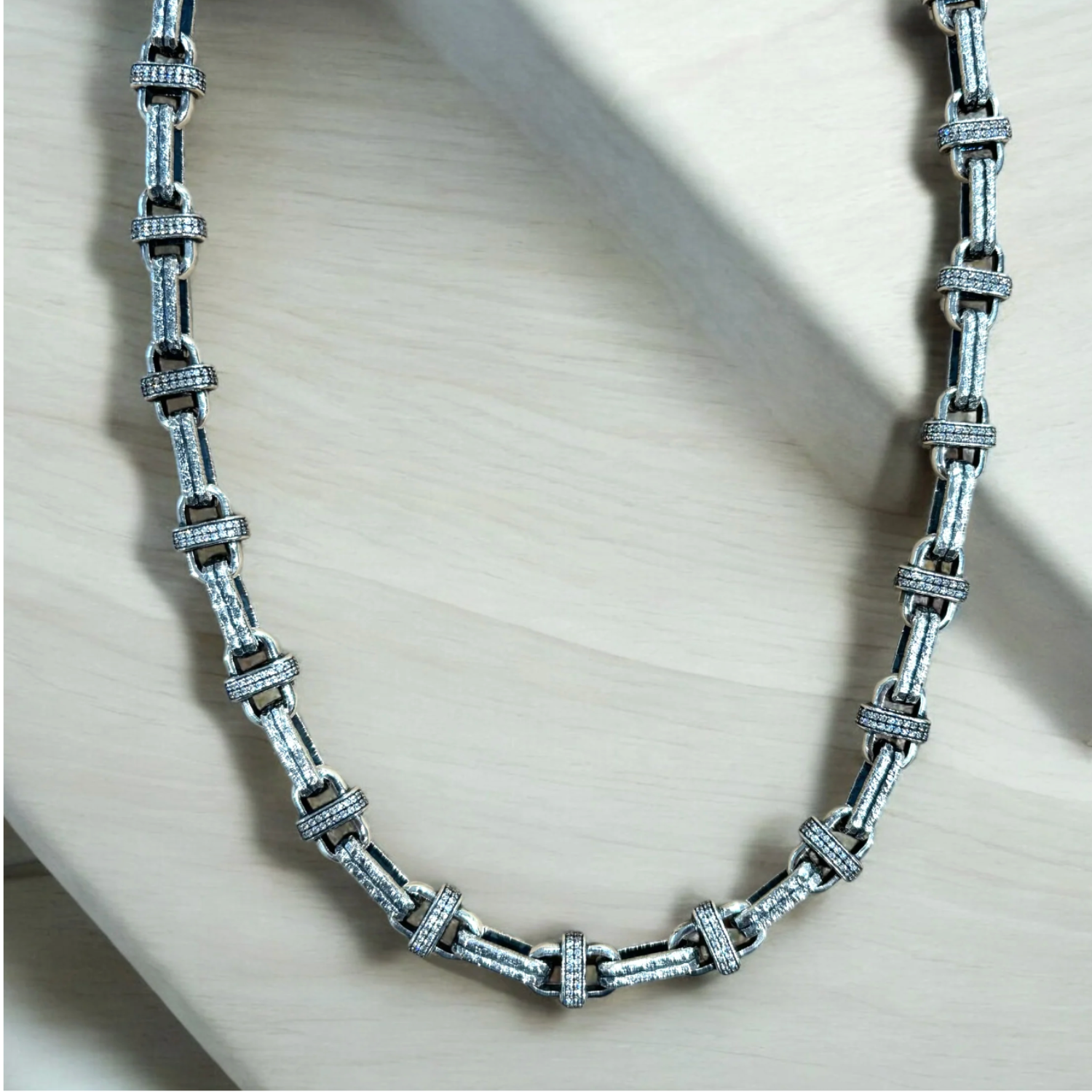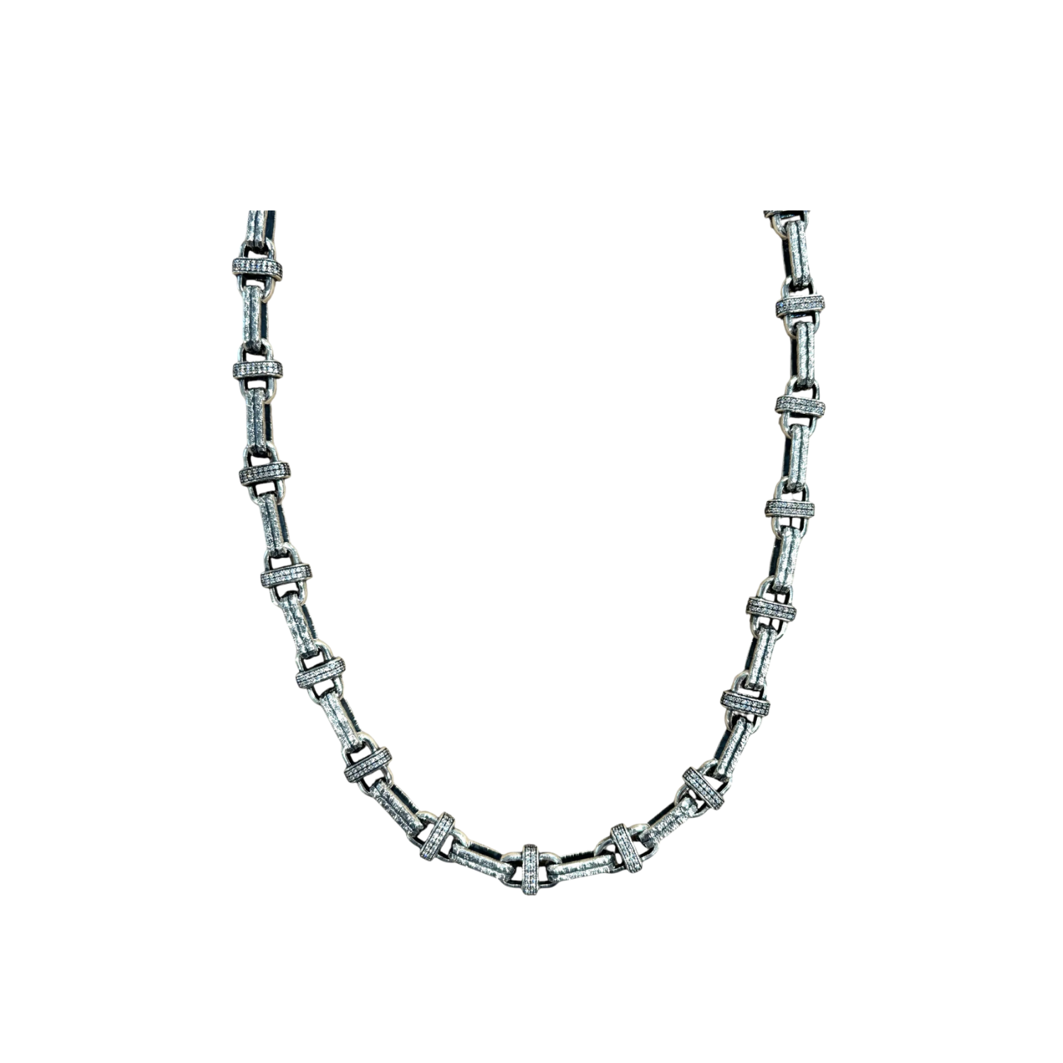 This vintage-inspired statement necklace from Tat2 Designs features richly textured sterling-silver–plated links, each accented with hand-set cubic zirconia pavé for a subtle yet sophisticated shimmer. The unique construction of the metal links gives the piece an architectural feel, while the pavé detailing adds an elegant, dress-up-or-down versatility. Finished with a toggle closure, this necklace layers beautifully or stands powerfully on its own
