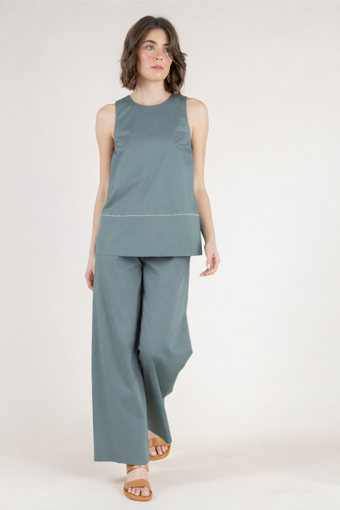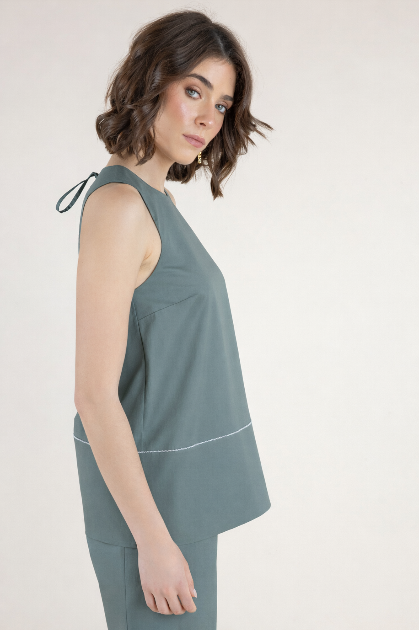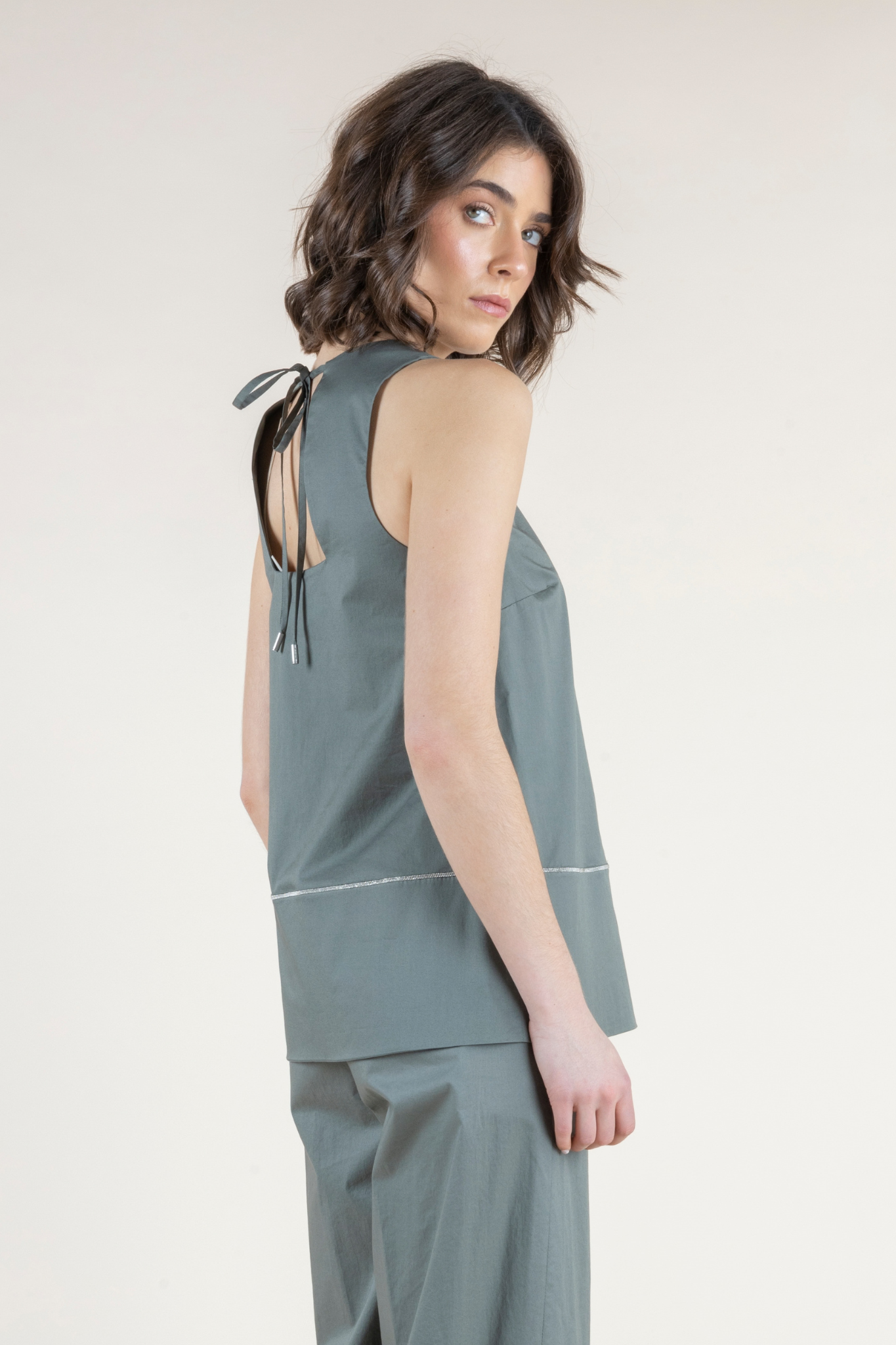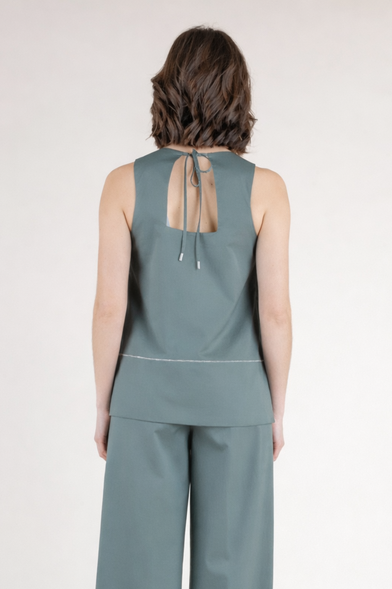 Clean, modern, and effortlessly refined, the Agno Top by Peserico is a beautifully tailored piece designed to elevate everyday dressing. Crafted from crisp cotton poplin with a touch of stretch, this sleeveless silhouette offers a lightweight, breathable feel with a smooth, structured finish. The relaxed shape drapes elegantly over the body, while subtle detailing—including a delicate stitched seam and a graceful tie-back keyhole—adds a sophisticated, contemporary touch. Rendered in a soft eucalyptus hue, the Agno Top pairs seamlessly with the coordinating Cornetto Pants for a polished Italian ensemble that is both relaxed and refined. Timeless and versatile, it is a piece that moves effortlessly from day to evening with understated elegance
