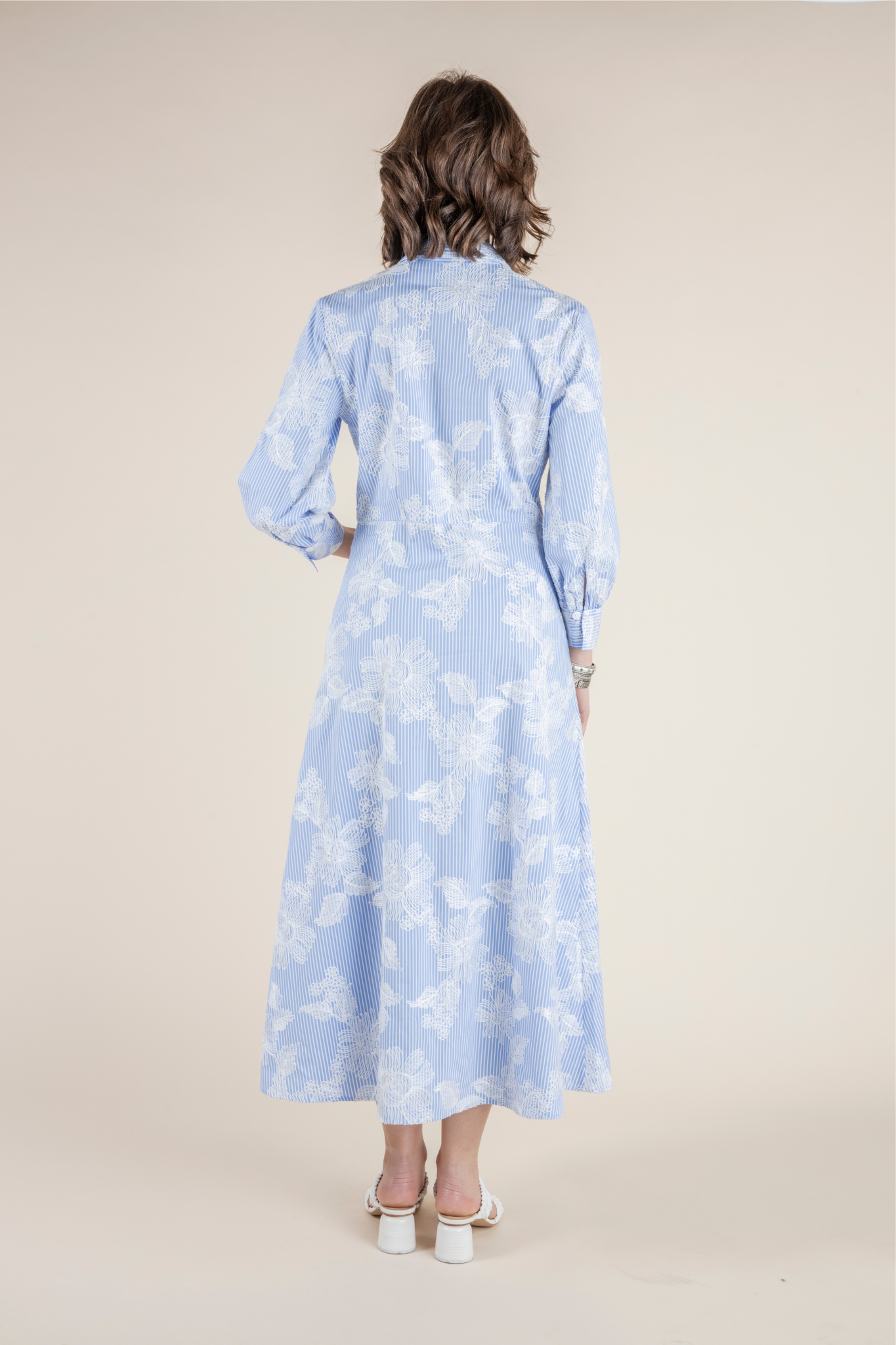 A refined take on warm-weather dressing, the Cinisello Dress blends classic tailoring with a soft, feminine touch. Finished in a delicate bianco sky palette, the design features crisp blue pinstripes layered with an airy white floral motif, creating depth and subtle texture throughout the silhouette. The shirt-style bodice is framed by a structured collar and full button front, while the gently fitted waist flows into an elegant midi-length skirt that moves beautifully with every step. Crafted from a breathable cotton blend with a hint of stretch, the Cinisello offers comfort and polish in equal measure—perfect for sunny days, travel, or effortless everyday elegance. Roll the sleeves for a relaxed daytime look or pair with simple accessories for an elevated finish