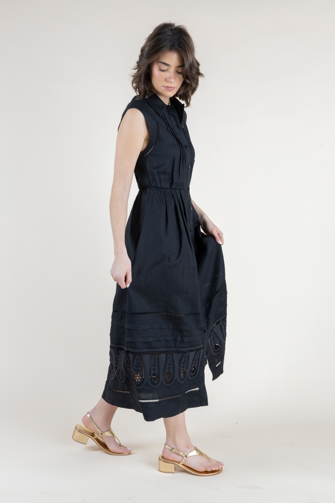 The Gardino Dress by Purotatto embodies effortless Italian elegance with a refined, airy feel perfect for warm-weather dressing. Crafted from 100% linen, this sleeveless shirt dress silhouette features a classic button-front design and a softly tailored waist that flows into a graceful midi-length skirt. Delicate cutout embroidery along the lower skirt adds texture and artisanal detail, creating subtle movement and dimension while maintaining the dress’s understated sophistication. Finished in timeless nero, the Gardino Dress strikes a beautiful balance between structure and breathability, making it an ideal piece for both daytime refinement and relaxed summer evenings. Lightweight, polished, and quietly striking, it is a piece that reflects Purotatto’s signature blend of craftsmanship and modern Italian style