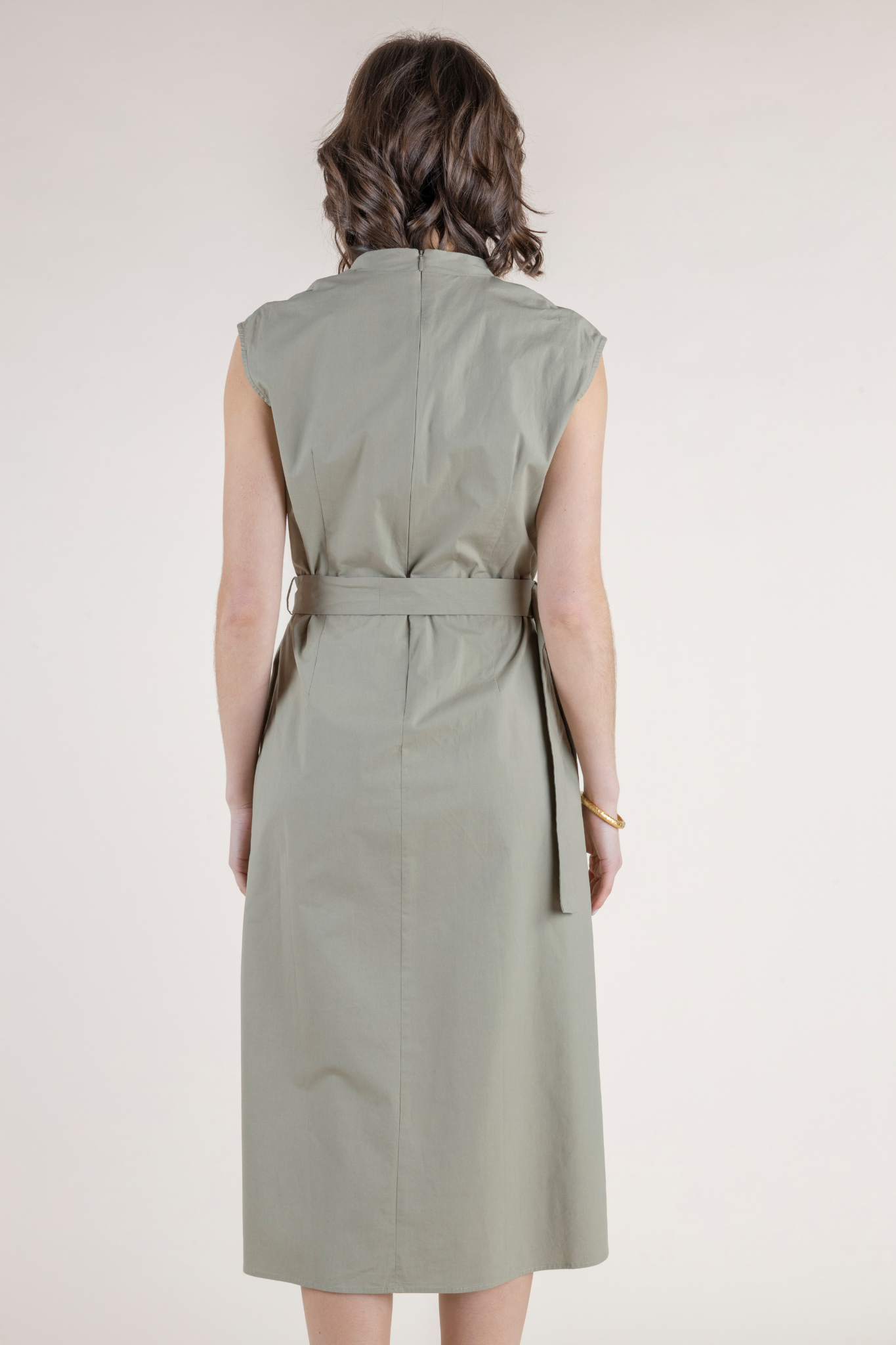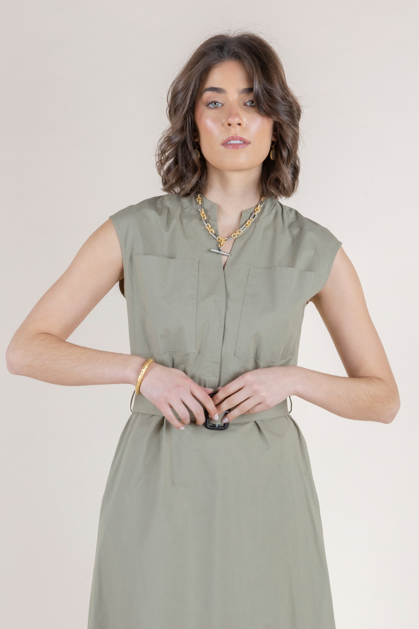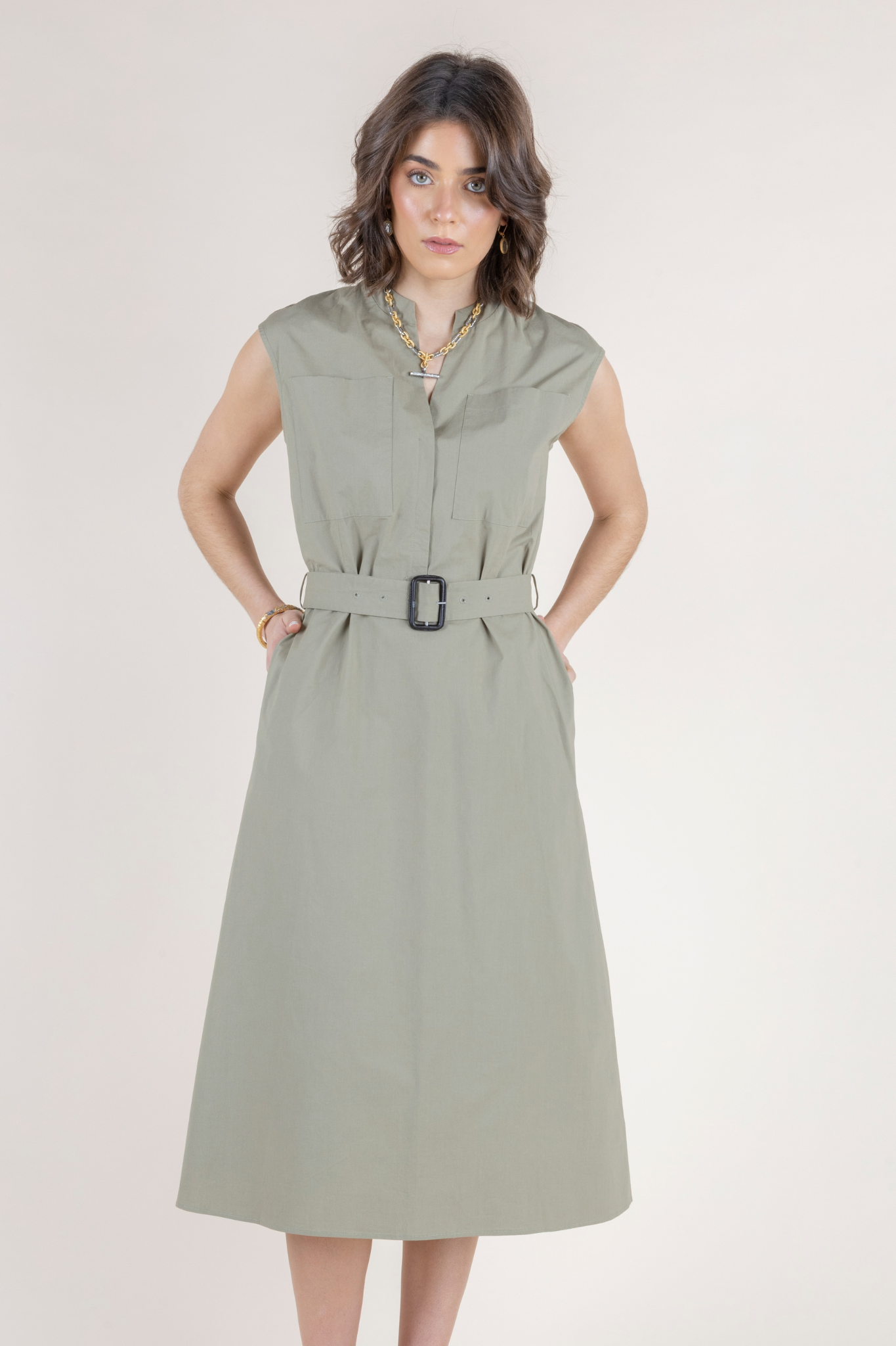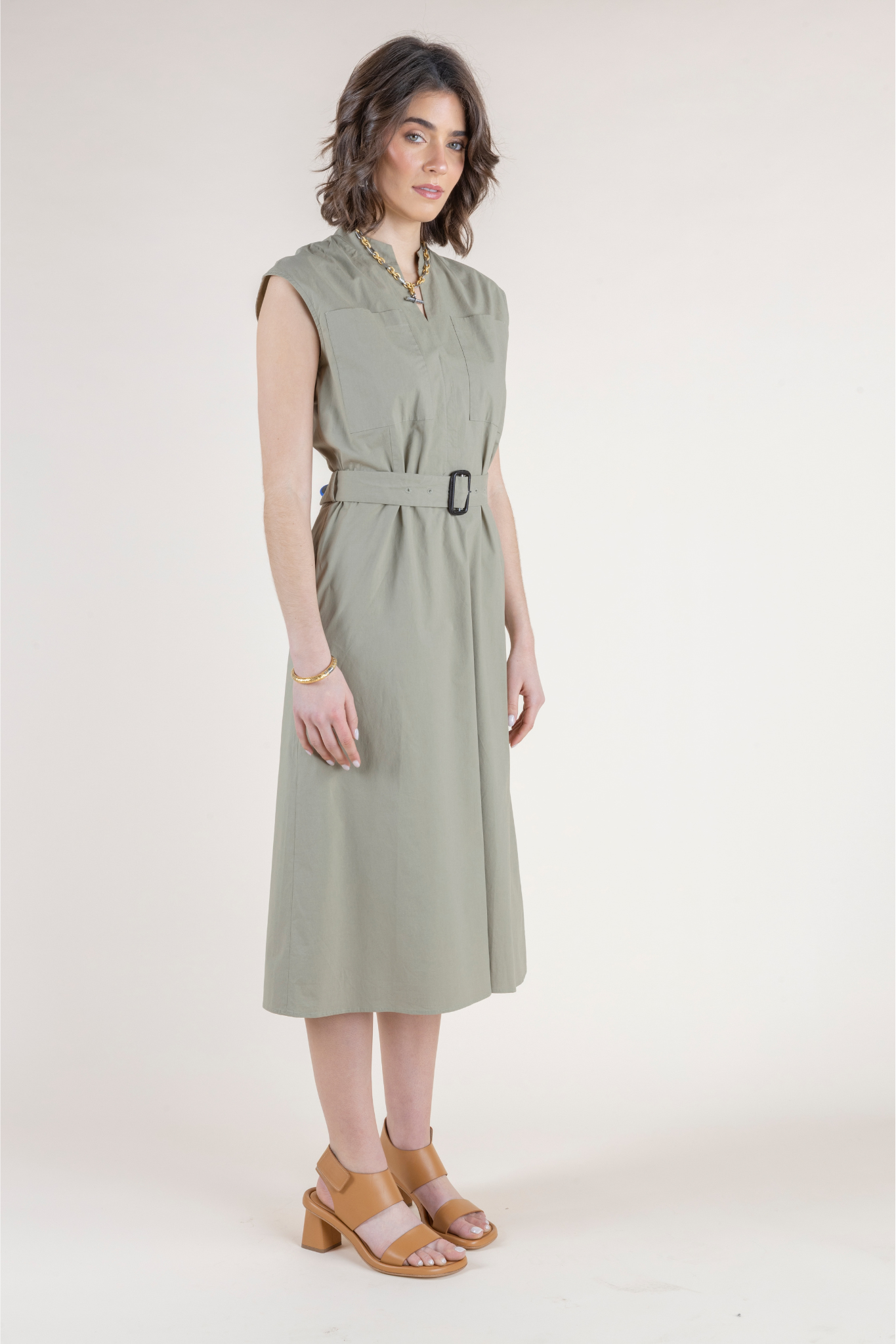 A standout piece from the MODA Spring/Summer Collection, the Leon Dress perfectly balances modern structure with effortless wearability. Tailored in a soft sage green, this refined silhouette features a sleek sleeveless bodice with subtle cap shoulders and clean lines that flatter the waist before falling into an elegant mid-length skirt. A detachable belt allows for adjustable styling—wear it cinched for a defined shape or remove it for a more relaxed, streamlined look. Crafted from a breathable cotton stretch blend, the Leon Dress offers both comfort and practicality. The fabric is lightweight, wrinkle-resistant, and ideal for travel, making it a versatile option for warm-weather days, city outings, or effortless summer events. Polished yet easy, it embodies the quiet sophistication synonymous with Italian design
