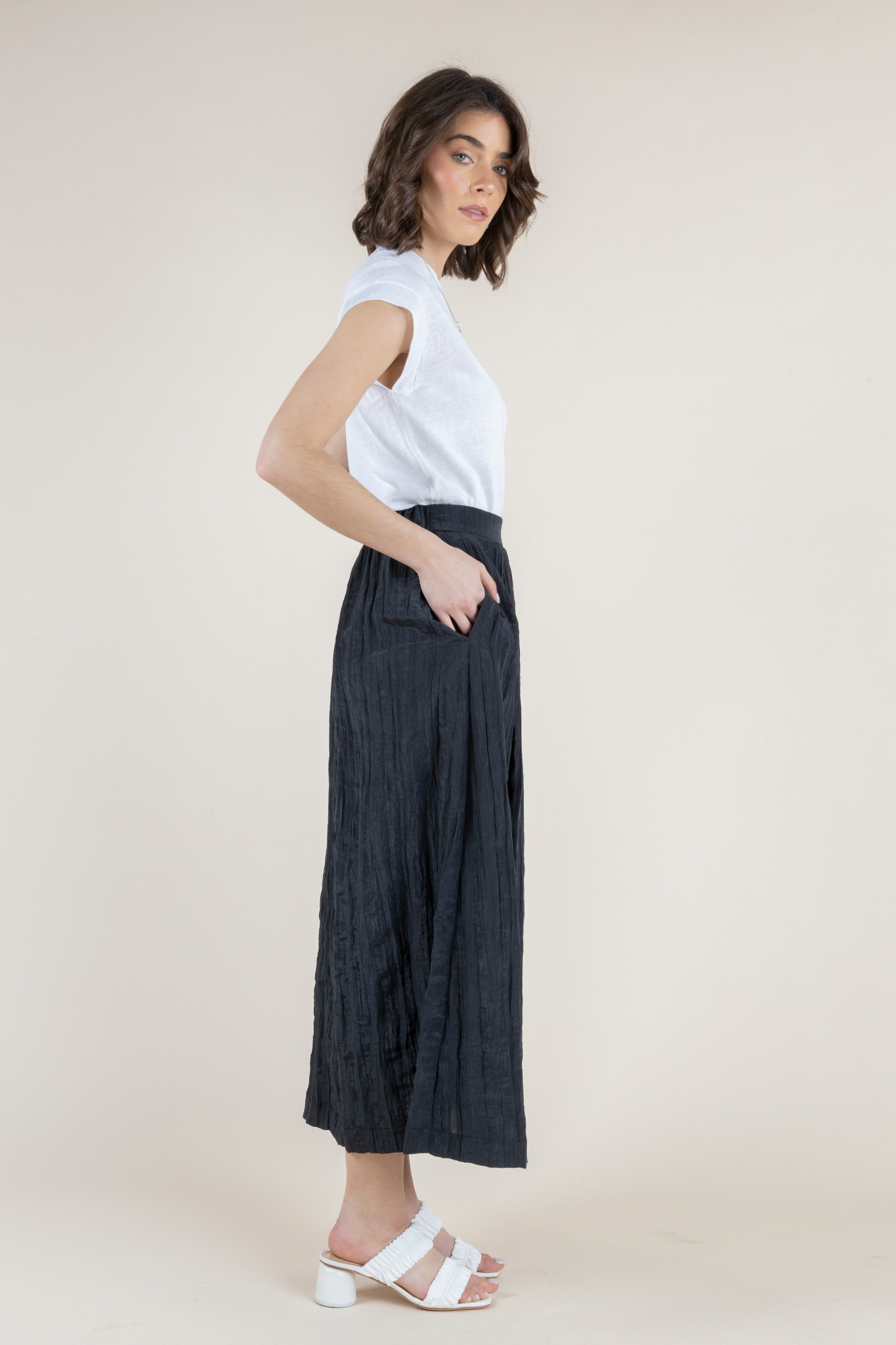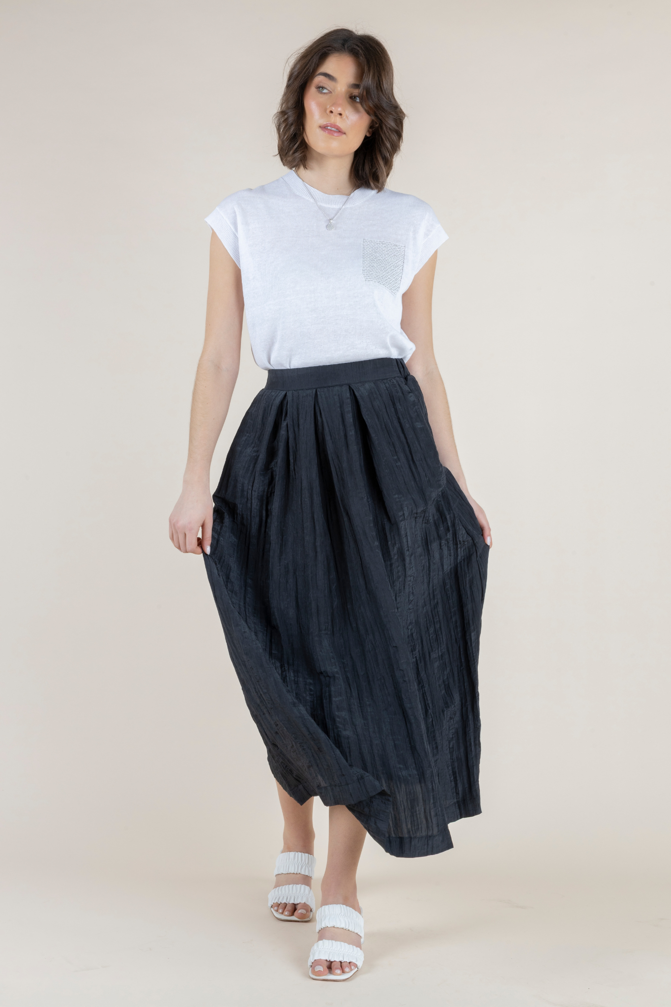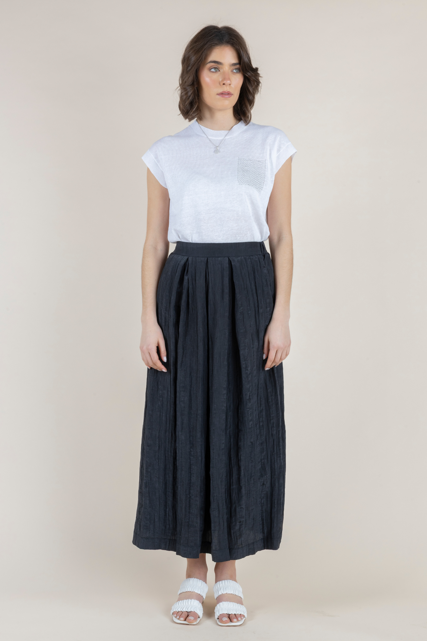 Elegant movement meets modern texture in the Orazio Skirt by Hubert Gasser. Designed with a softly structured high-waisted silhouette, this midi-length skirt features delicate pleating that creates graceful flow with every step. The subtle crinkled texture of the fabric adds dimension and sophistication while maintaining a lightweight feel. Rendered in timeless nero, the Orazio Skirt pairs effortlessly with everything from refined knits to crisp cotton tops, making it a versatile staple for both everyday elegance and polished occasions. Its fluid drape and clean waistband create a flattering shape that balances structure with ease. Crafted in Northern Italy, the skirt reflects Hubert Gasser’s signature attention to refined tailoring and understated luxury